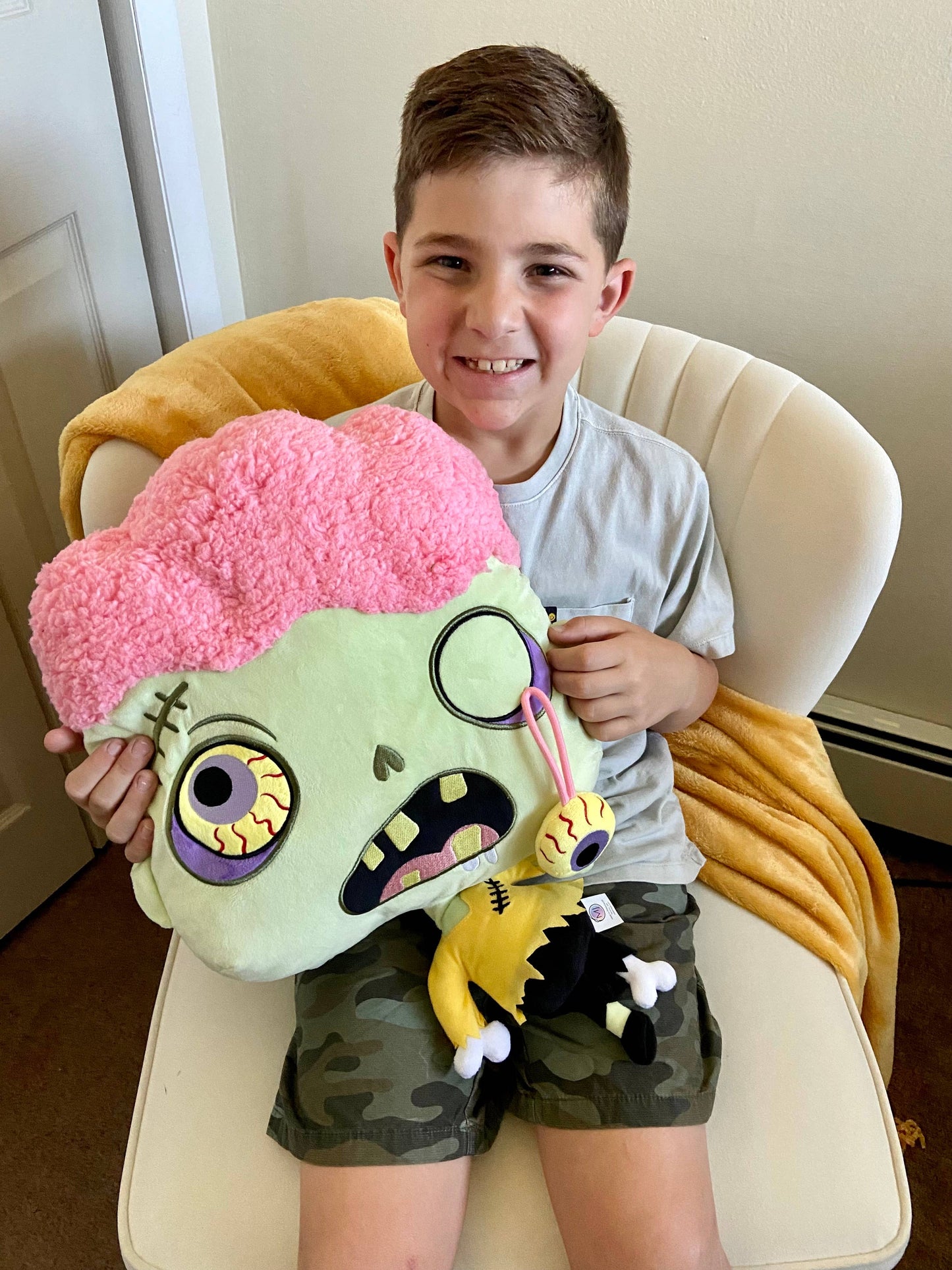 Hope you don’t scare easily because our creepy Zombie plush pillow (and his BRAAAINS) are ready to hang with you! This hilarious take on an undead friend is a great addition to your Halloween collection and a fun festive touch to your spooky home decor. This Halloween plush is made entirely of high quality soft plush fabrics and measures 18” tall with a perfect 12" x 12" cushy head for lounging! *This item is not intended for children under 3 years old. *Small batch production. *Spot cleaning only is recommended.