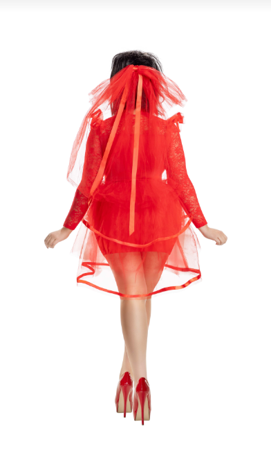 Red Beetlejuice style dress. Stretchy, with beautiful lace sleeves and a red veil!