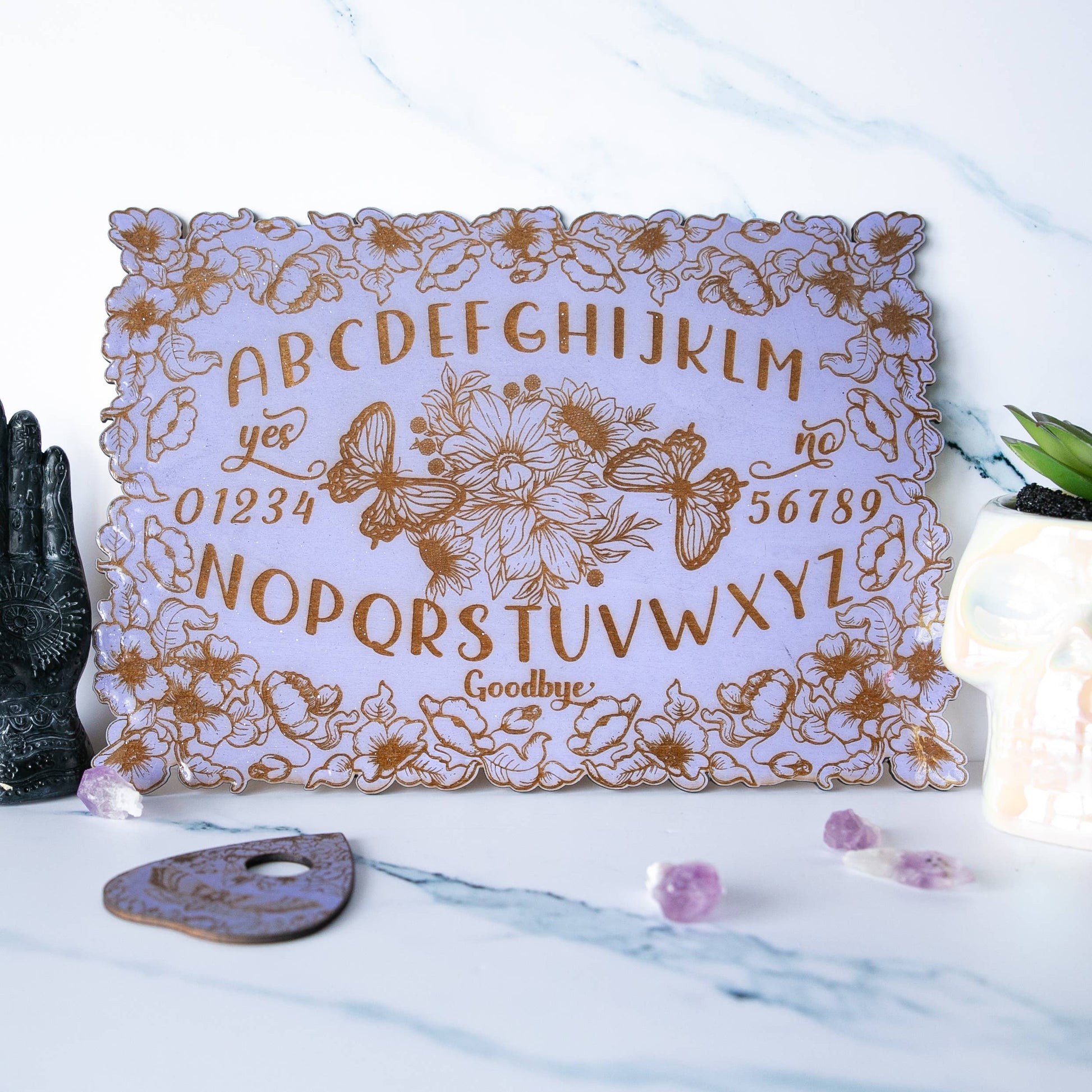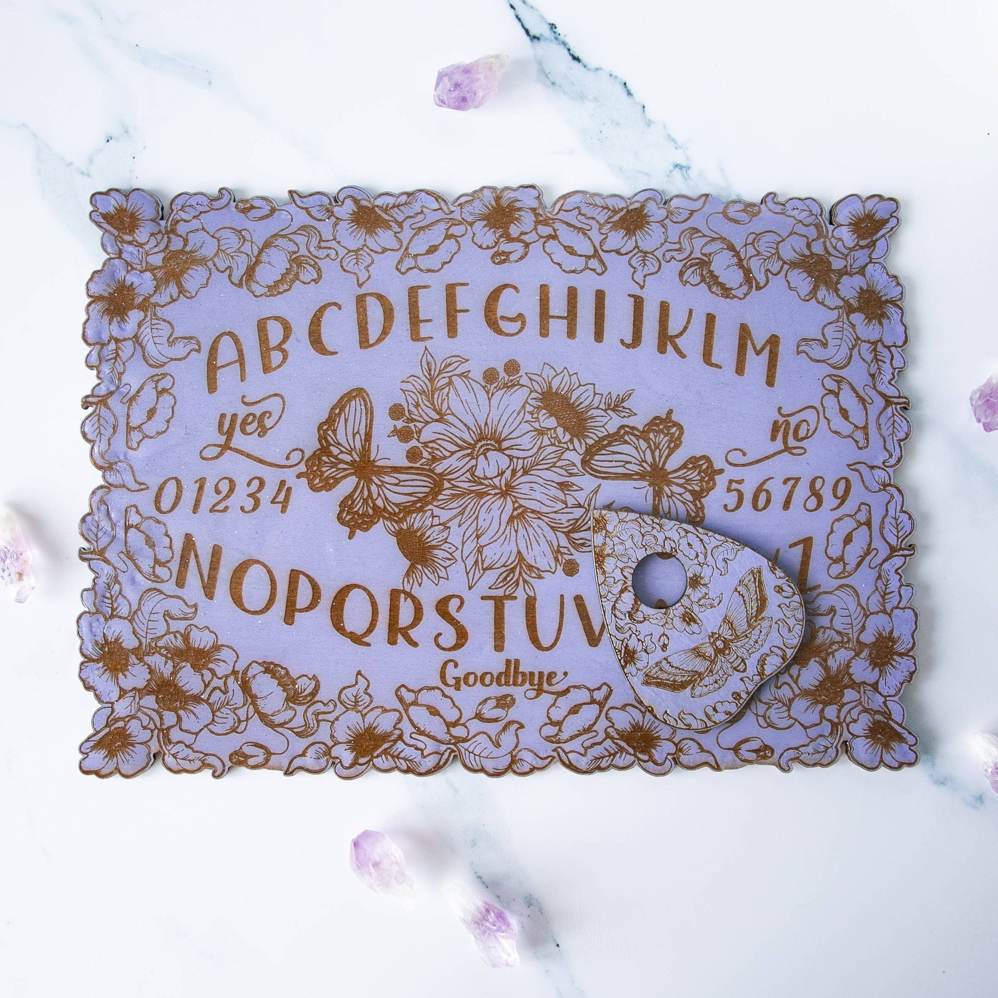 Our custom engraved butterfly spirit board offers every collector or practitioner an elegant addition to their collection. Board includes matching planchette of your choice. Includes engraved wood board with planchette. Board measures 14 x 10”, planchettes measure approximately 3.25 x 2.5".
