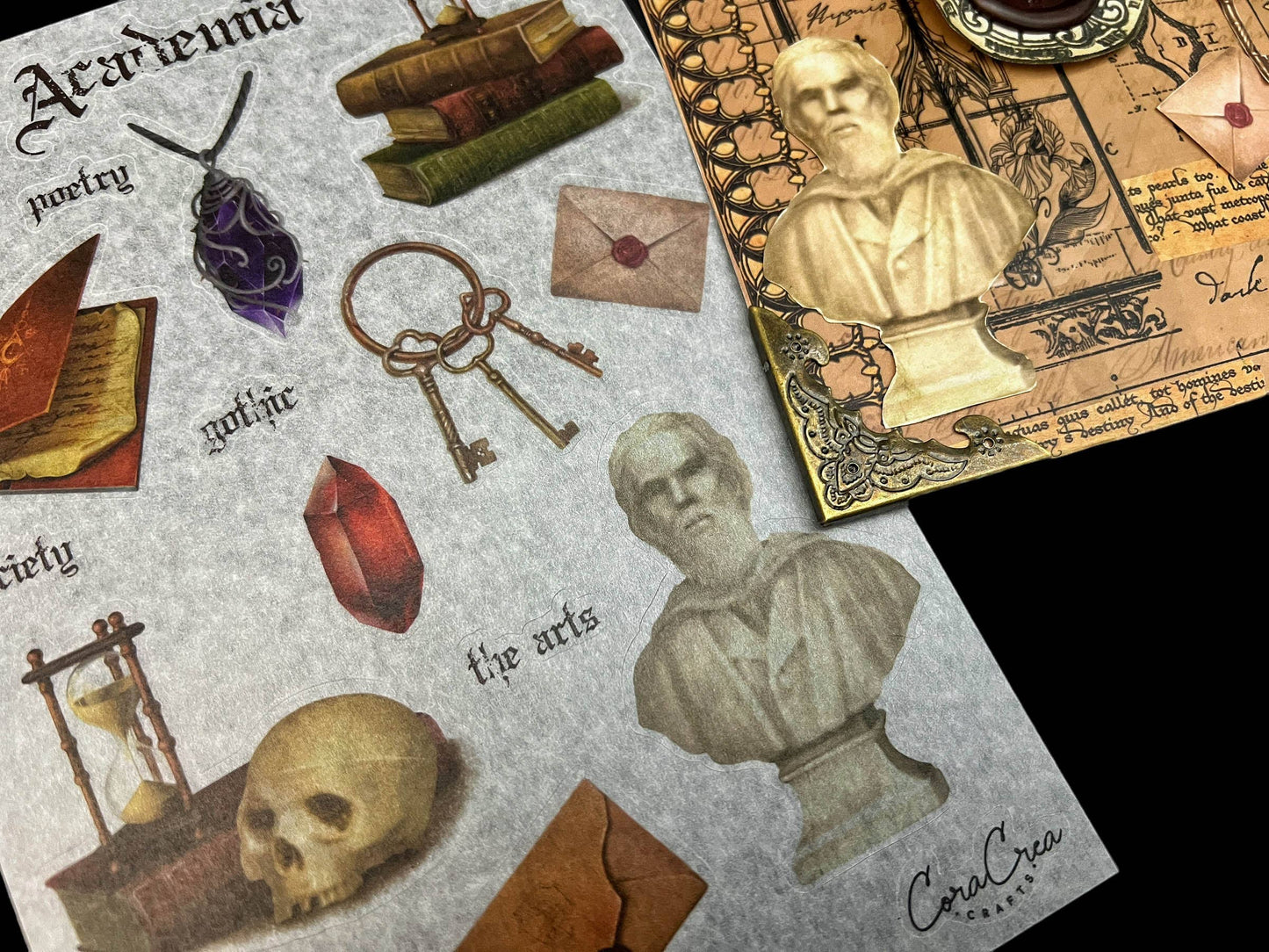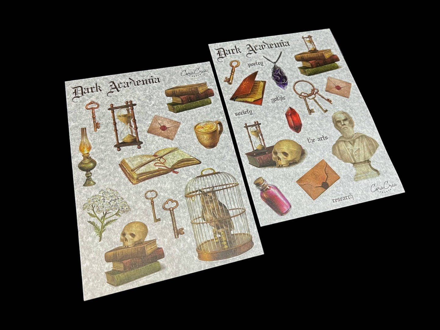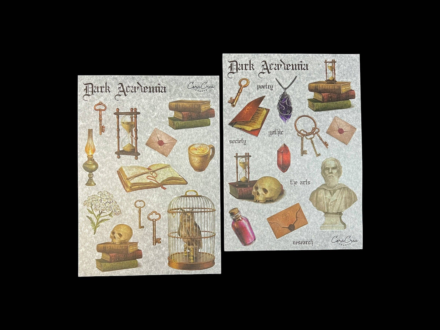 This new set of 2 sticker sheets will make you live the dark halls of academia. This is an exclusive design by CoraCreaCrafts.These high quality stickers are printed on washi paper.Measurements: each sticker sheet is an A5 sizeThese stickers are great for crafts, bullet journaling decoration, scrapbooking, collage, junk journaling or as a small gift.Check out our entire stickers selection here