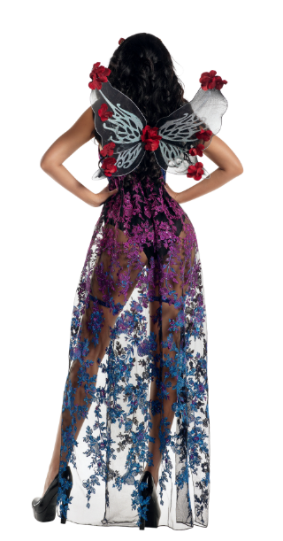 Gorgeous fairy costume embellished with shimmering lace that fades from purple on the top to blue on the bottom. Includes fairy wings