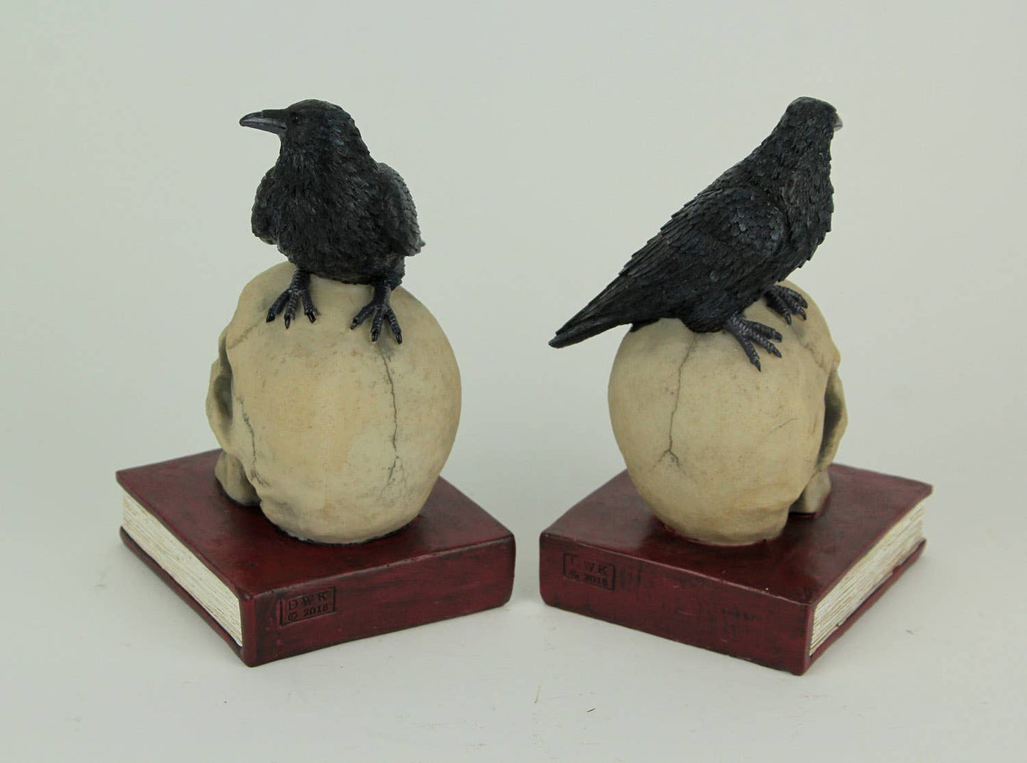 Straight out of a gothic nightmare, these mystical shape shifters quietly perch on old human skulls, not daring to make a sound for they just might wake the dead. Bring a touch of the macabre to your decor with this resin raven and skull bookend set sure to keep your book collection in line. Let them hold up a few books or you can display them for their creep-tastic looks alone on a side table or mantel, and placing a potted plant in between creates a creepy cool look that brings a touch of dark charm into your living space. This set of 7 inch high, 4.5 inch long, 4 inch wide skull and raven bookends bring a touch of poetic mystery to any decor setting
