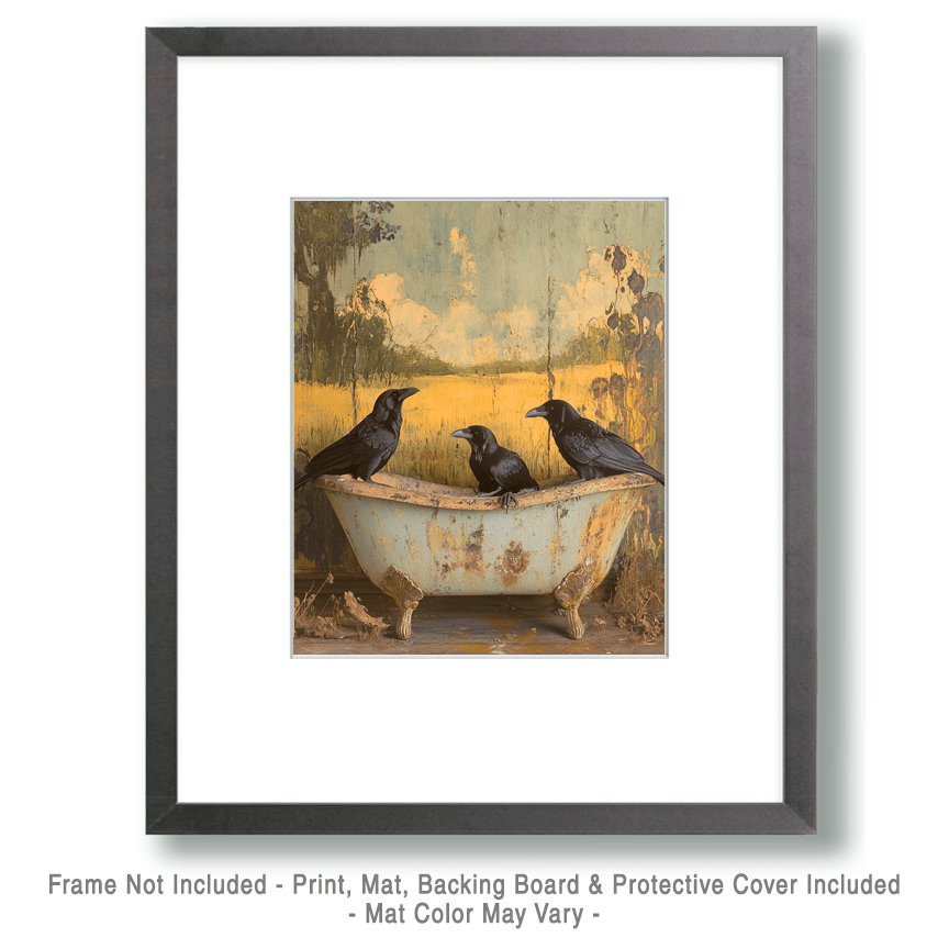 Folk Art Ravens in Bathtub - Bathroom Wall Art Prints – w/Gold 11″x14″ Frame