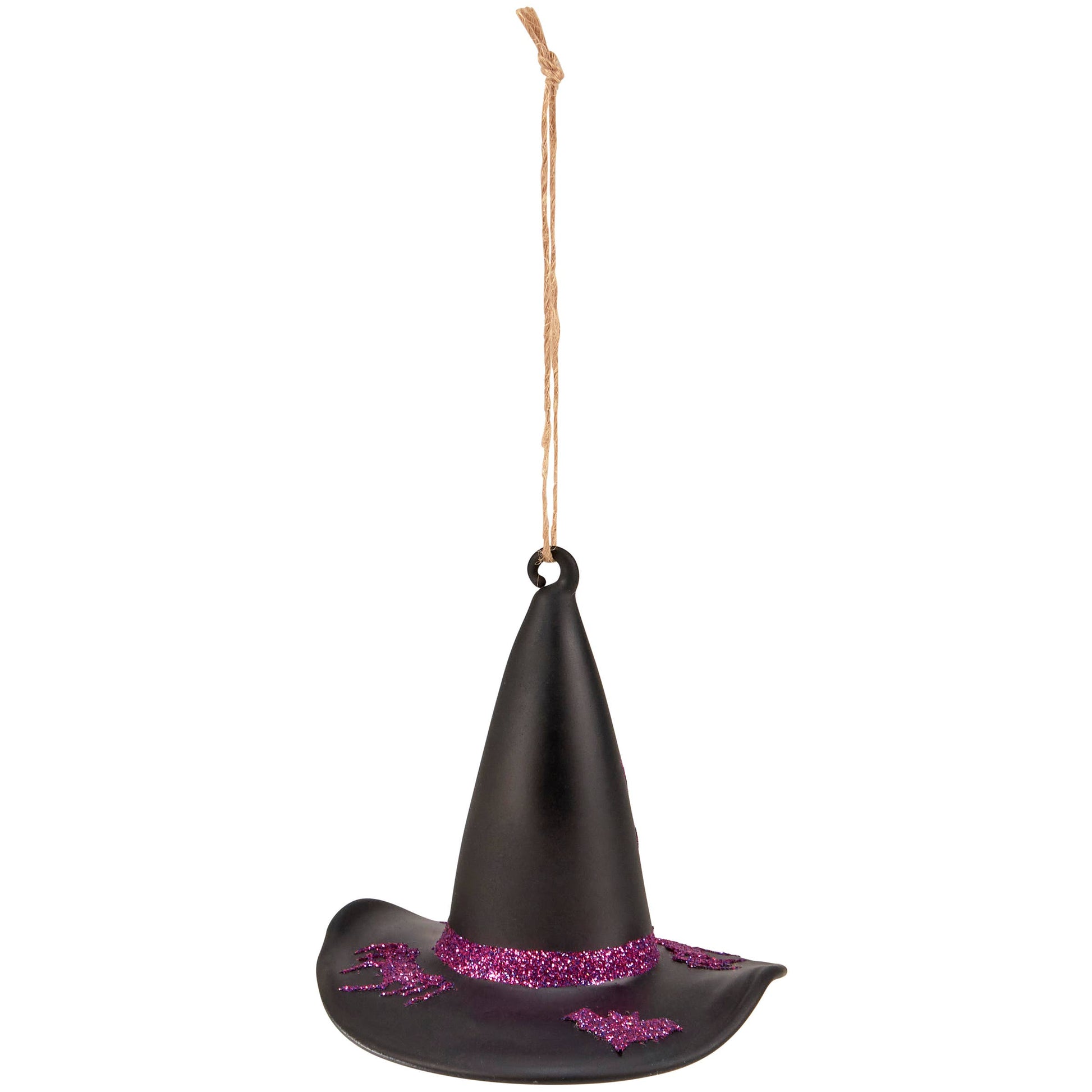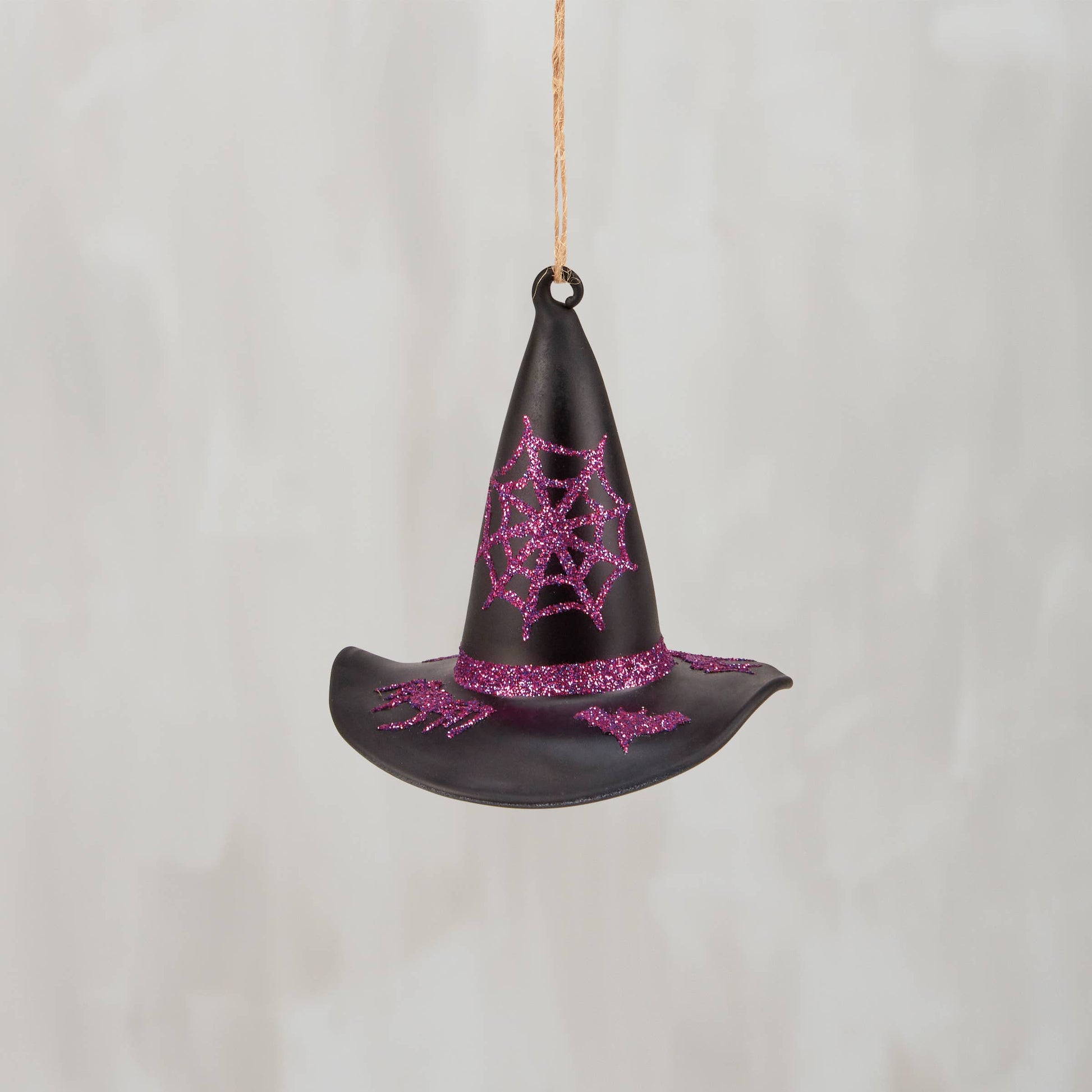 A glass ornament from our Halloween Collection displaying a matte black witch hat design with purple glitter designs. Our glass Witch's Hat ornament is ready to hang via the included top loop. A vintage home accent perfect for seasonal display.