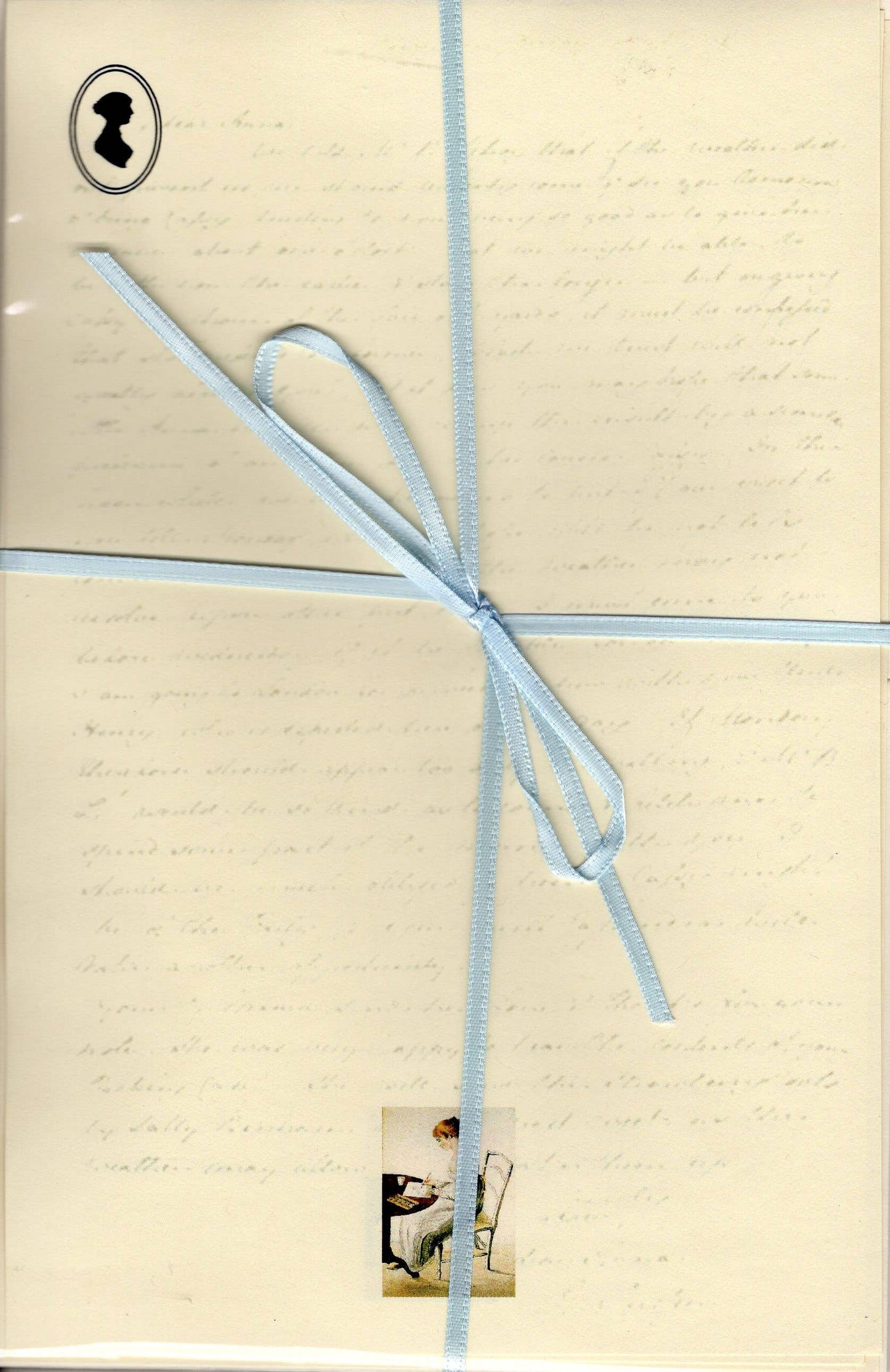 Designed by The Marble Faun, the Jane Austen Writing Paper Set features a watermark in Austen's handwriting, her iconic silhouette, and a family image of a young relative at her writing desk.