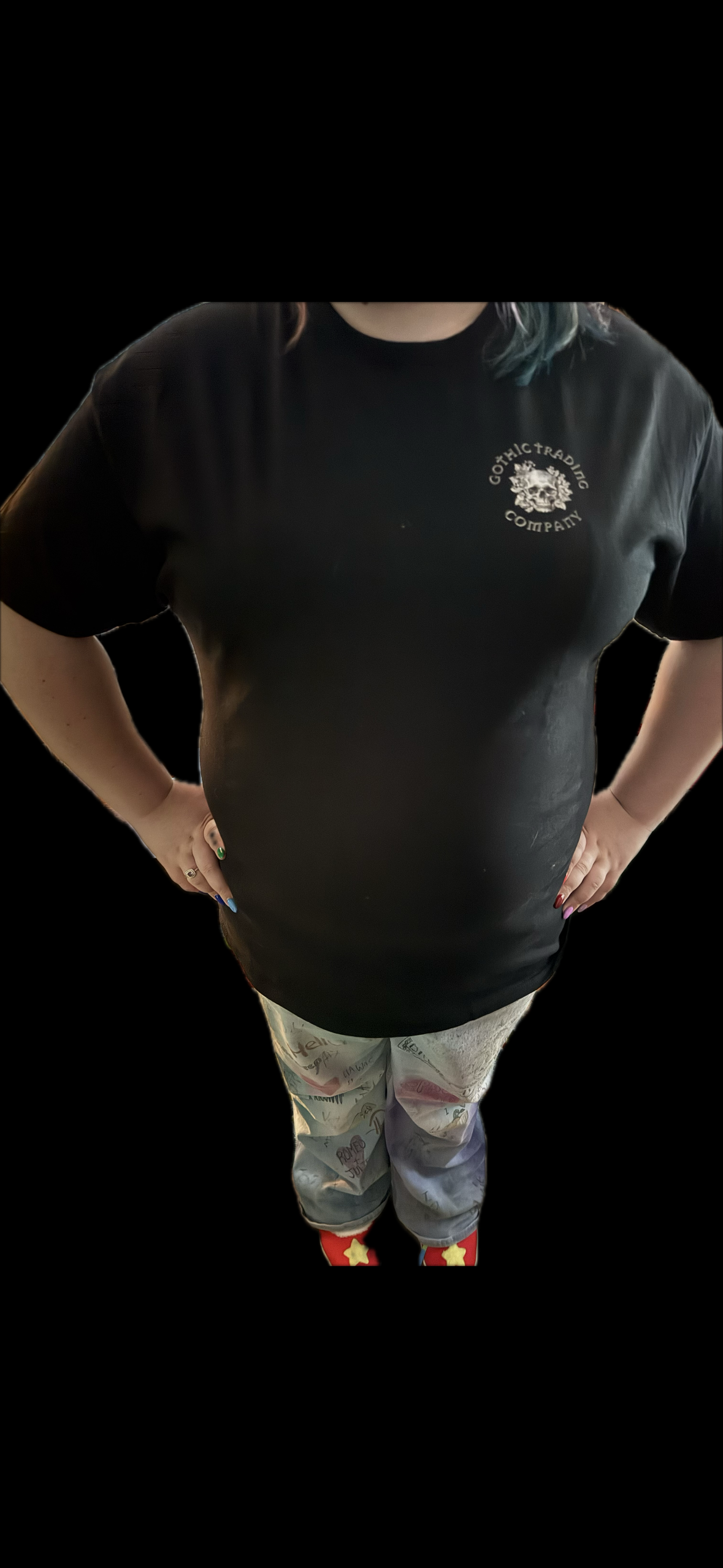 The official Gothic Trading Company t-shirt! Made of heavy 100% cotton, with our beautiful logo on the back, it is sure to be a staple! It is a standard men’s t-shirt fit. To make it more punk, trim the collar off!