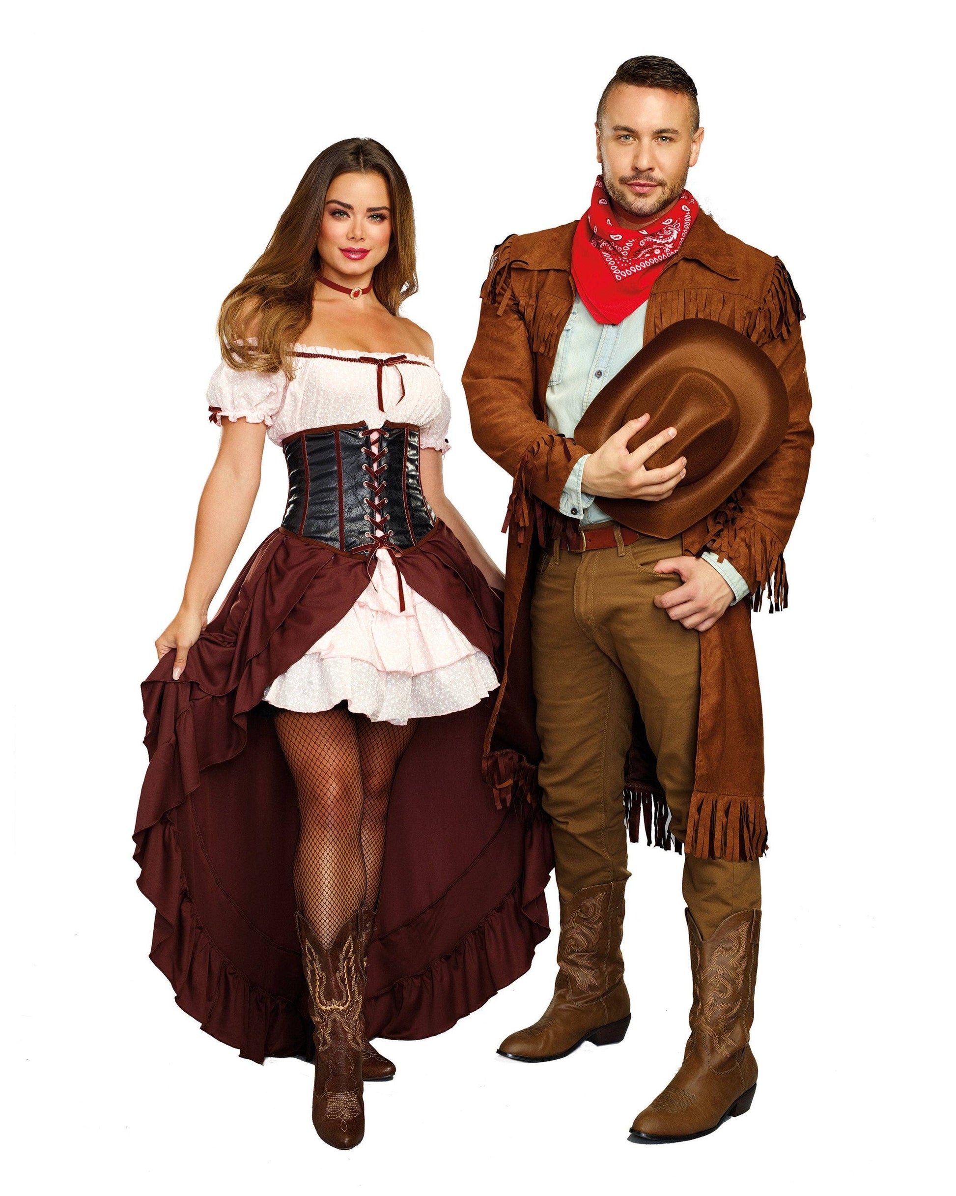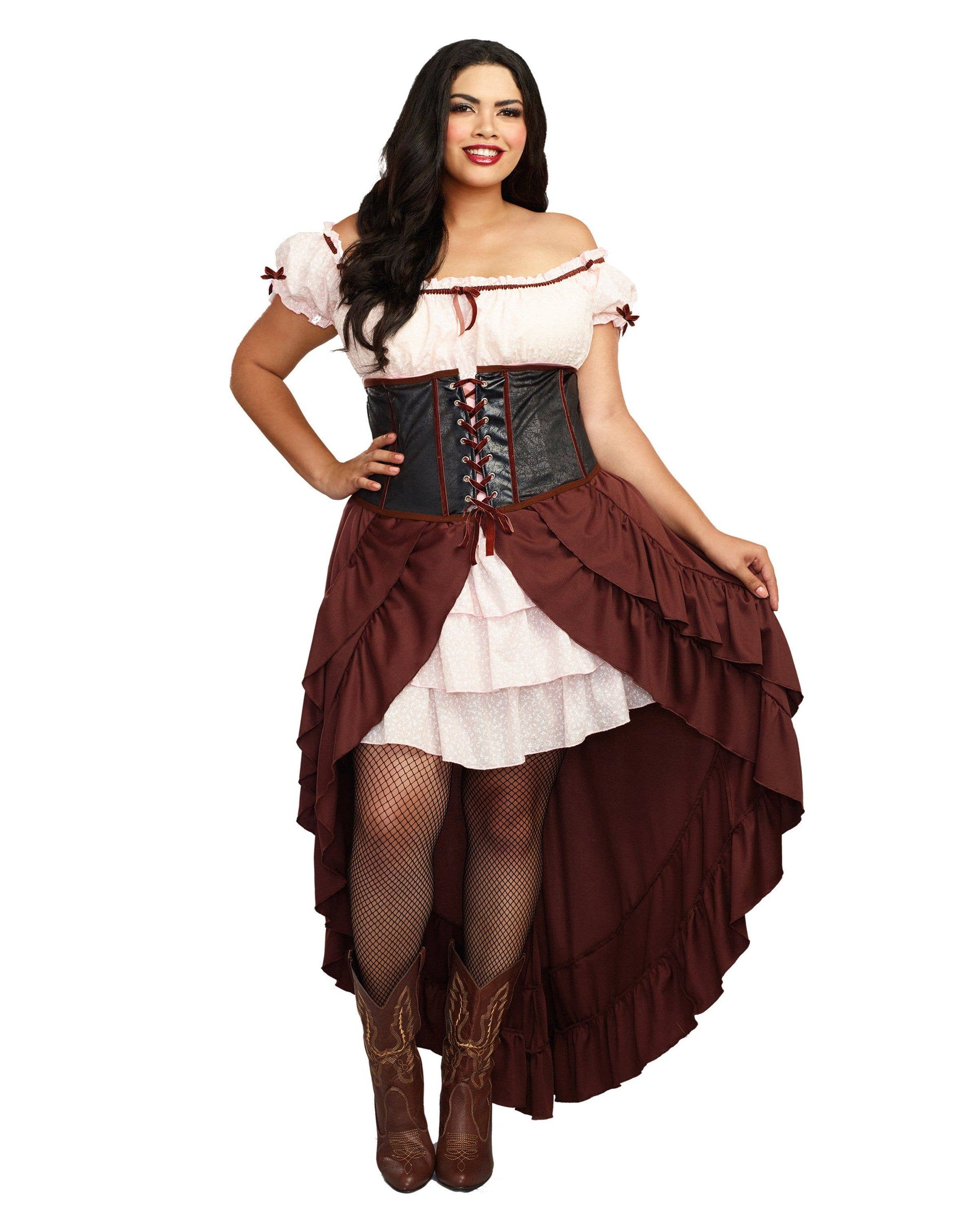 You would think dating this gal would be lots of fun until you're staring down the barrel of her gun! * Costume Includes an ultra-flattering, western-styled off-the-shoulder dress with attached skirt and distressed leather-look lace-up waist corset. * Choker and petticoat not included *
