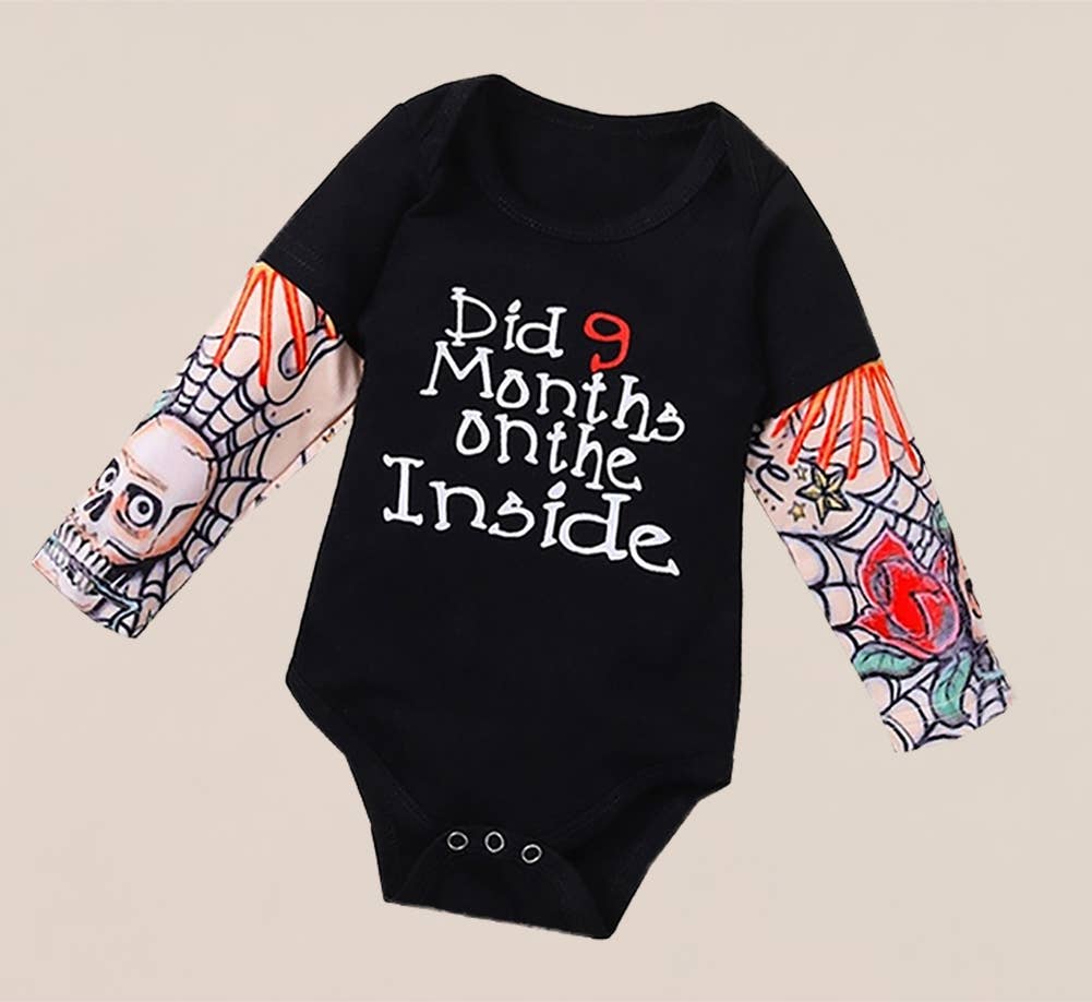 The adorable tattoo-printed cotton bodysuit features a "Did 9 Months on the Inside" funny message print on the front, while the sewn-in tattoo sleeves are printed using high-quality sublimation printing so the color will not fade. Crotch snaps allow for easy changing. Pair them with your favorite bottoms to style up his/her outfit. MATERIAL: Cotton CARE: Machine wash