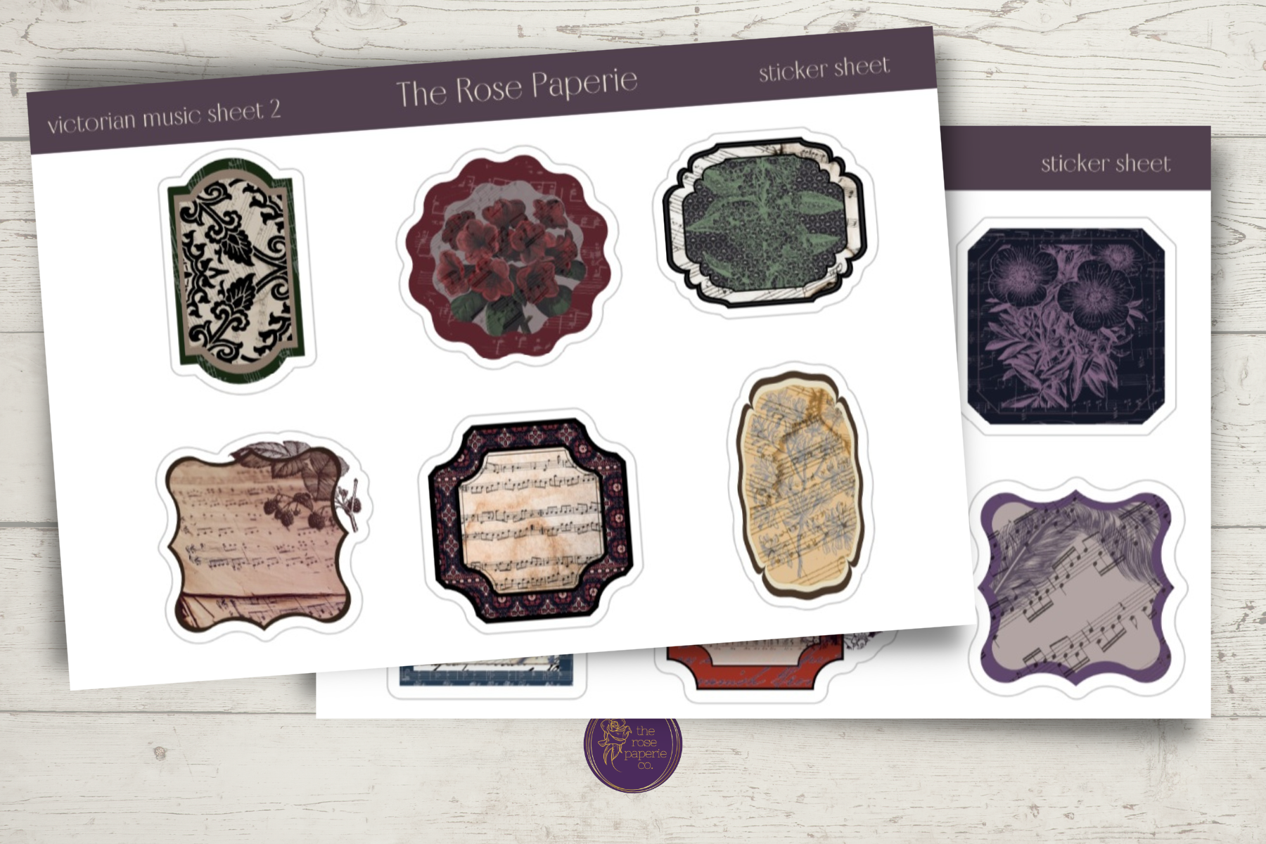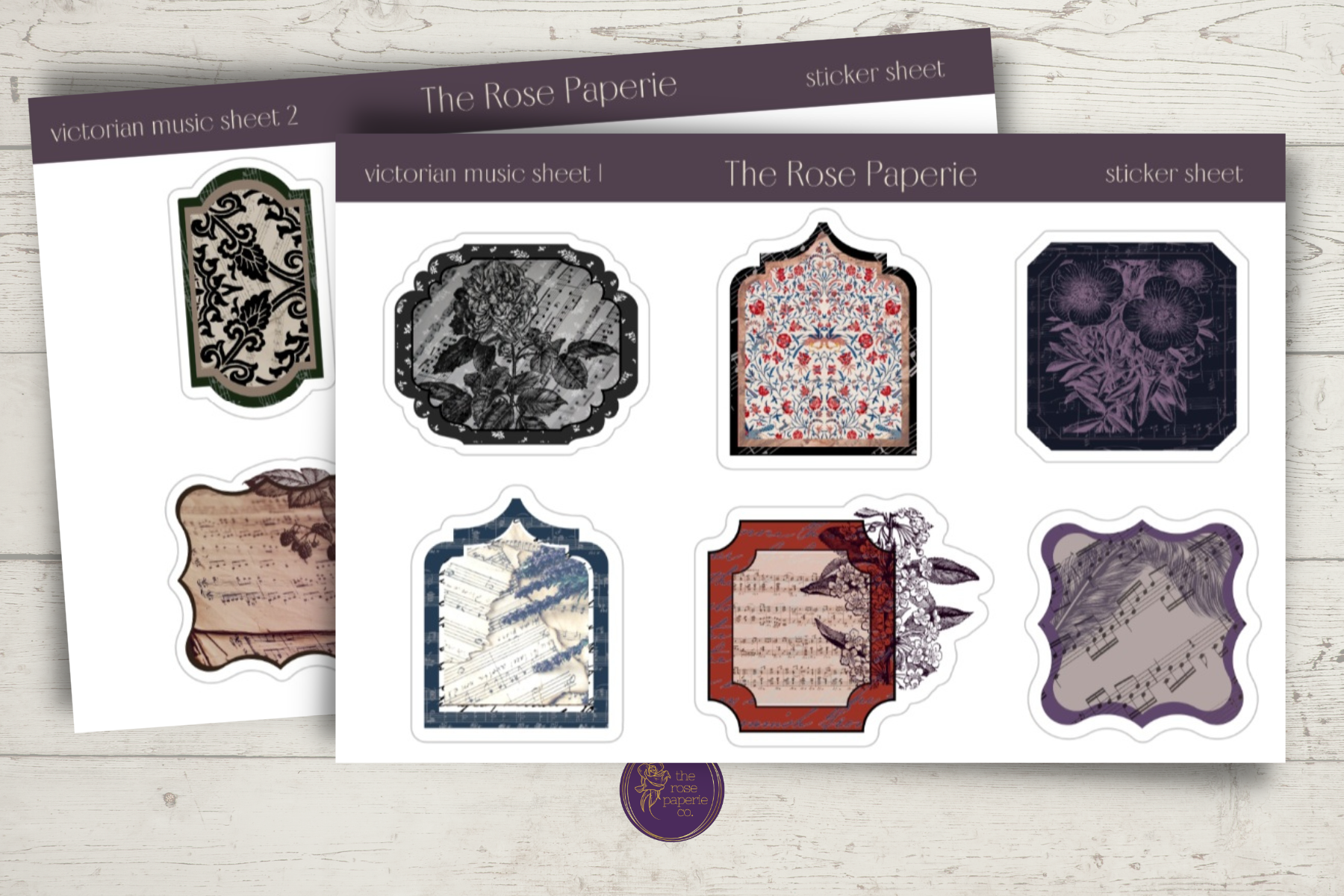 Music notes, florals and vintage letters are set on a 6 x4 sticker sheet. One order is for two sheets of stickers with 12 unique stickers. Stickers are printed on a recycled paper with an eco-friendly satin matte finish. Stickers are not waterproof. All stickers are packed in a clear eco-friendly sleeve.