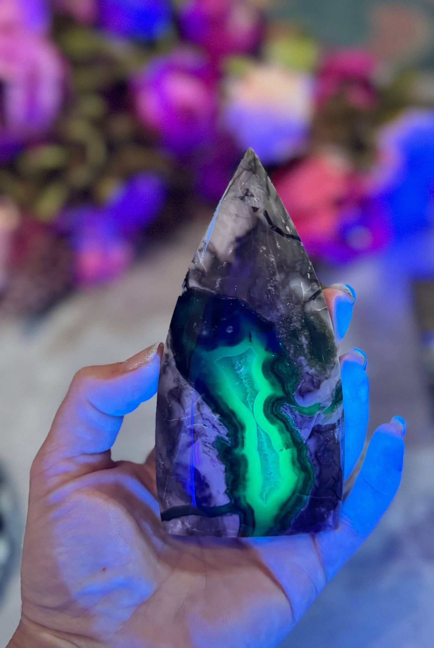 Volcano Agate Teardrop Freeform, UV Fluorescent Green Crystals